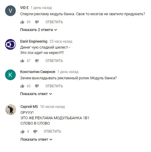 На YouTube под роликом обсуждение менее дружелюбное — большинство обсуждает систему «Кэшбери» в целом, но есть и те, кто без наводки узнал чужую рекламу.