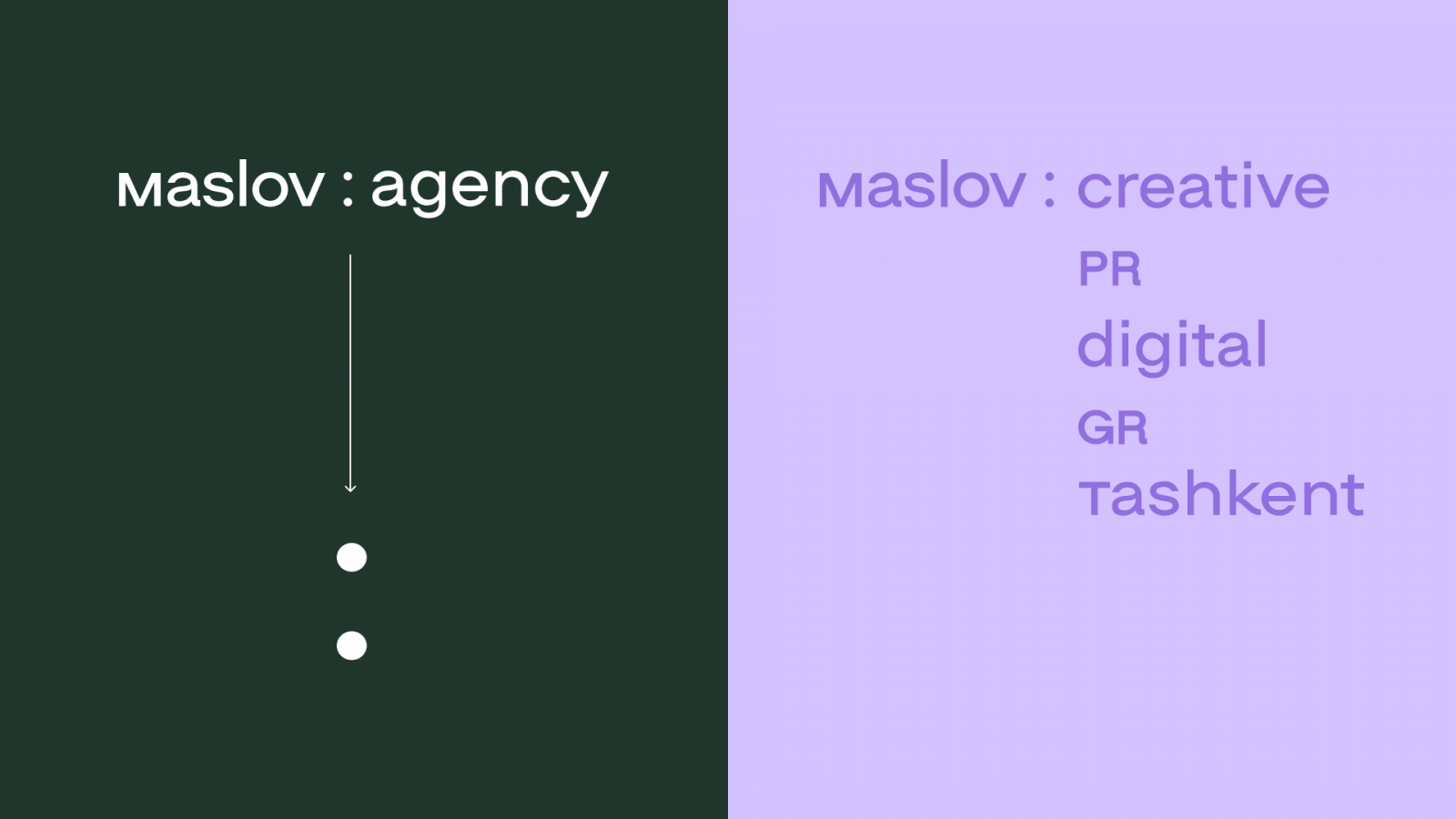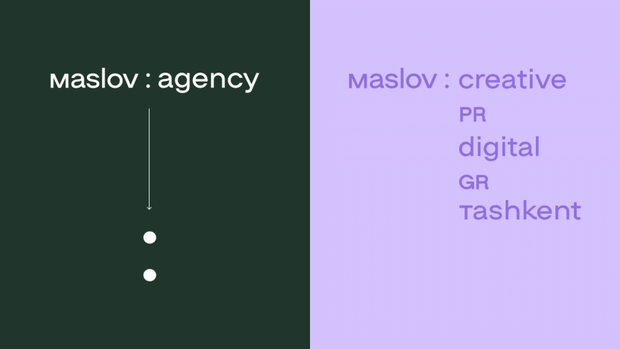 Двоеточие стало центральным элементом нового фирменного стиля. Акцентируя внимание на диалоге как связующем звене между брендом и его аудиторией, двоеточие в maslov:agency подчёркивает роль общения в этих отношениях, олицетворяет знания и технологии агентства по работе с аудиториями и открывает возможности для заигрывания суббрендов — maslov:creative, maslov:gr, maslov:digital, maslov:pr и maslov:tashkent и другие варианты.
