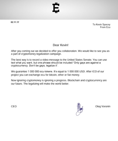 Каминг-аут Кевина Спейси вызвал резонанс в СМИ, на который отреагировали даже специалисты по блокчейн. С предложением об участии в кампании, направленной на легализацию криптовалют в США, к Кевину обратилась Ecu – блокчейн-платформа, которая сводит журналистов и тех, кто хочет пиар.