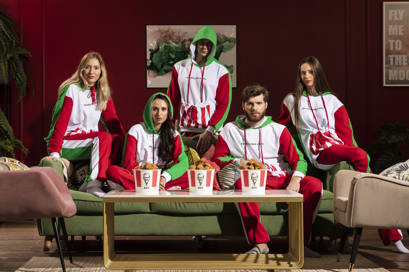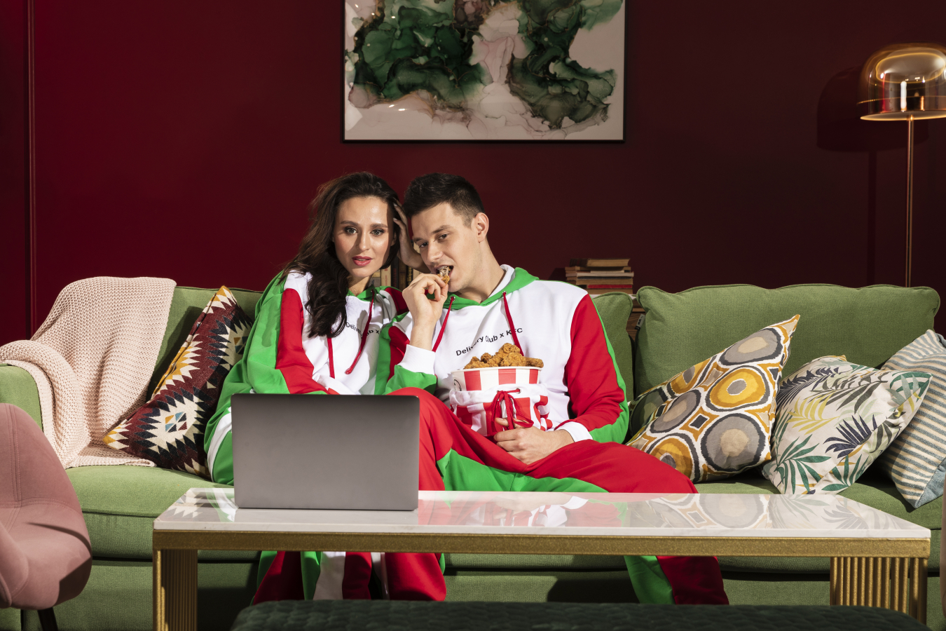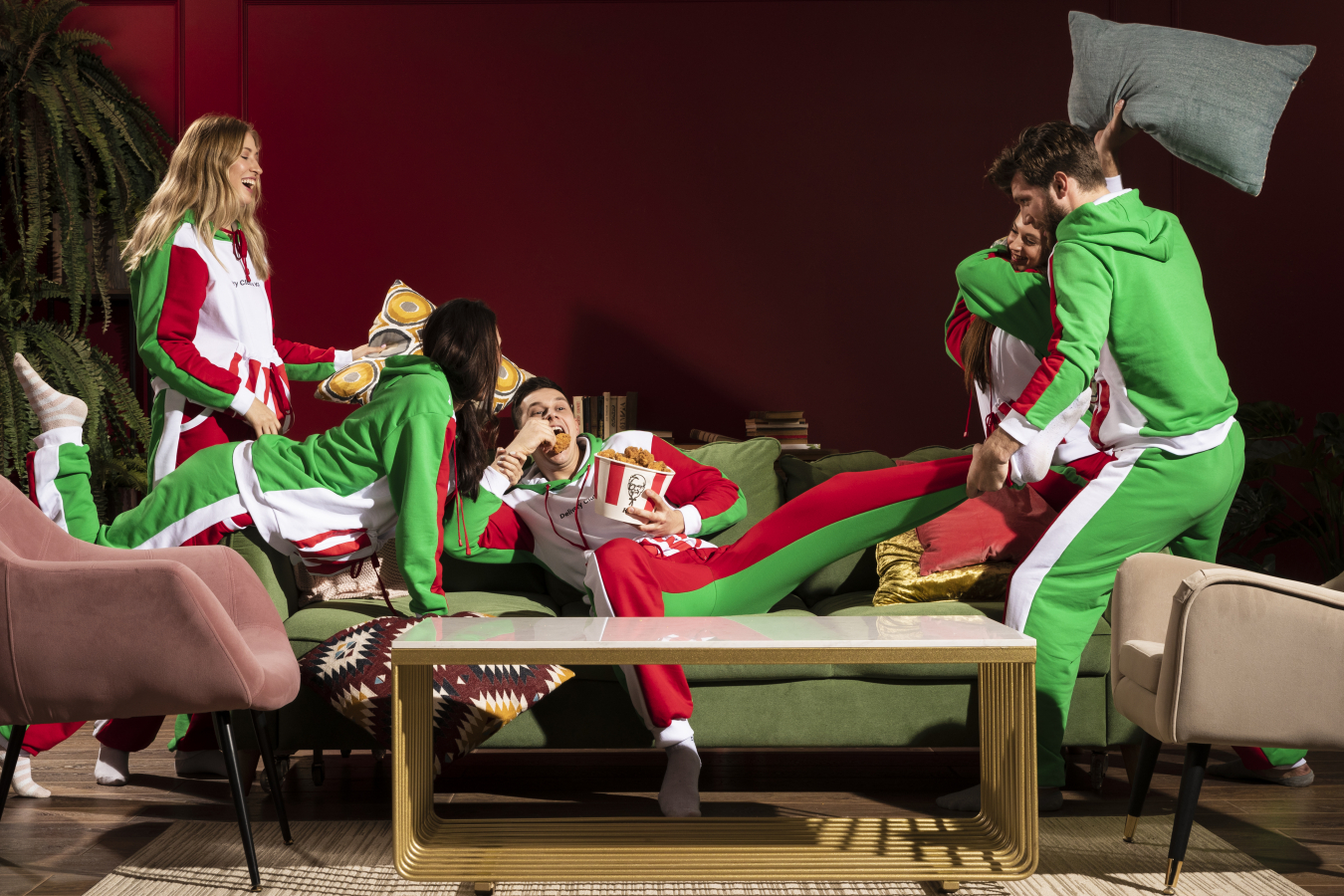 Сеть ресторанов быстрого питания KFC и сервис доставки Delivery Club к годовщине сотрудничества выпустили кобрендовые красно-зеленые пижамы с большим карманом для баскетов.