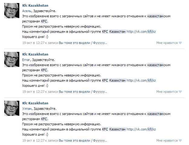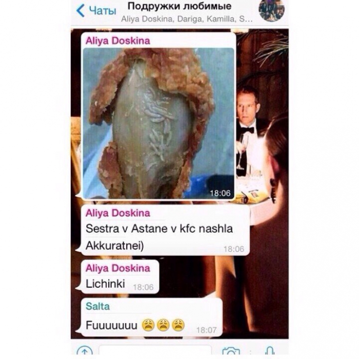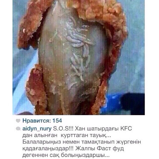 «KFC Казахстан» намерена выяснить, кто начал распространять фотографию с испорченной продукцией и портить имидж сети. Снимок, сделанный якобы в одном из ресторанов Астаны, появился в казахстанском сегменте соцсетей 18 октября. В частности, изображение курицы с личинками разместила в Instagram известная казахстанская певица Айнур Турсынбаева. После обращения представителей KFC она удалила поддельную фотографию и подтвердила, что стала невольной жертвой интернет-мошенников.