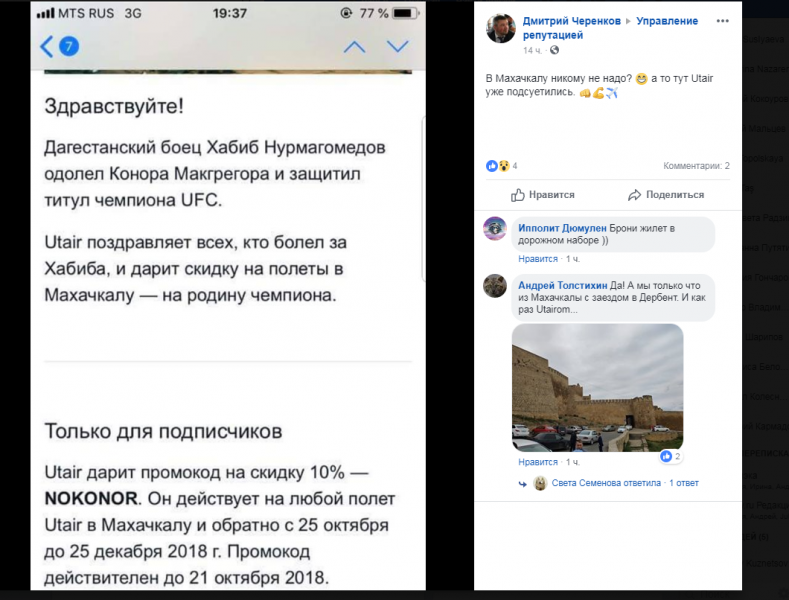Авиакомпания Utair дарит промокод-скидку на полёт в Махачкалу, родину Нурмагомедова.
