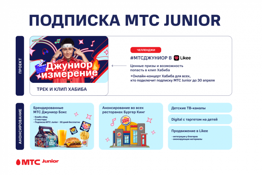 МТС запустил коллаборацию с «Бургер Кинг» и Хабибом для продвижения новой детской подписки МТС Junior. Весной в сети ресторанов можно будет купить брендированные детские обеды — «МТС Джуниор Боксы», в которые войдут комбо обед от «Бургер Кинг», два стикстера и подписка МТС Junior. Особо удачливым попадется редкий стиктер с Хабибом.