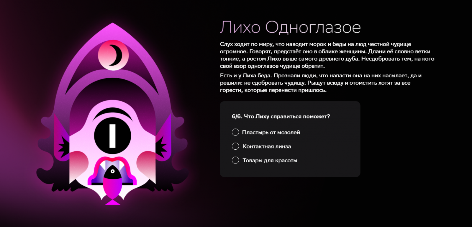 Сервис «Сбер Еаптека» запустил игру «Помогите монстру» — участникам предлагают проверить свои целительские навыки, подобрав средства от недугов для Лиха Одноглазого, Лешего, кота Баюна и других сказочных персонажей. Всем, кто пройдет тест до конца, станет доступен промокод на скидку. Также пользователи смогут узнать свой уровень способностей врачевателя: от «знахаря» до «лекаря поневоле».