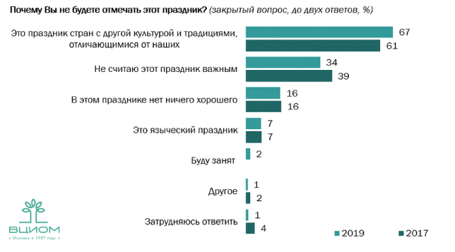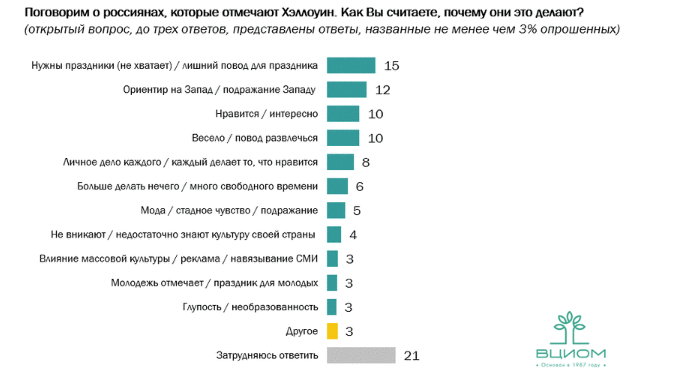 Согласно опросу, в первый раз услышали про Хэллоуин только 7% респондентов, 3% слышали про праздник и будут его отмечать. Чаще других заявляют о таких намерениях молодые россияне в возрасте от 18 до 24 лет. 90% респондентов о празднике слышали, но отмечать не планируют. Среди тех опрошенных, кто не будет отмечать Хэллоуин, большинство считает, что этот праздник предназначен для стран с иной культурой и традициями, треть опрошенных не считает праздник важным, а 16% не видит в этом празднике ничего хорошего.