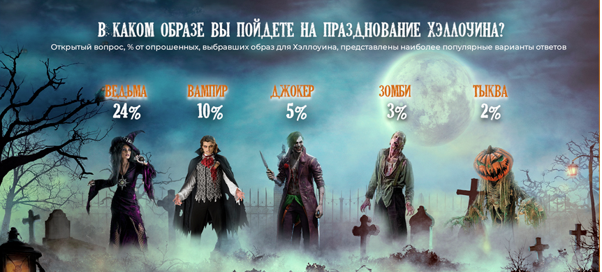 Россияне, которые собираются праздновать Хэллоуин предстанут на вечеринке в основном в образах известных киноперсонажей. Об этом рассказал в своей инфографике институт общественного мнения «Анкетолог».