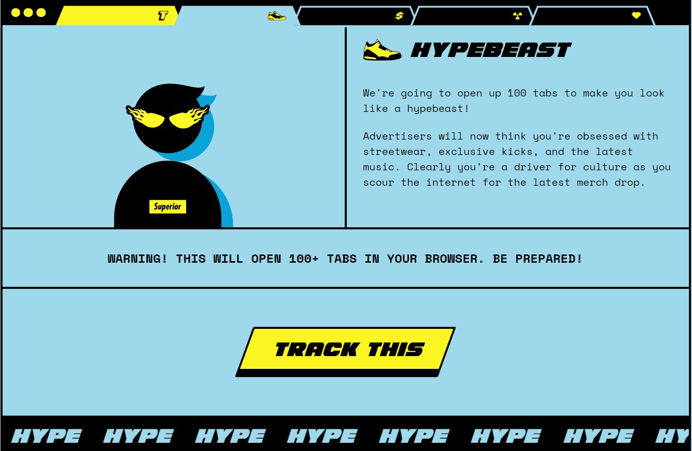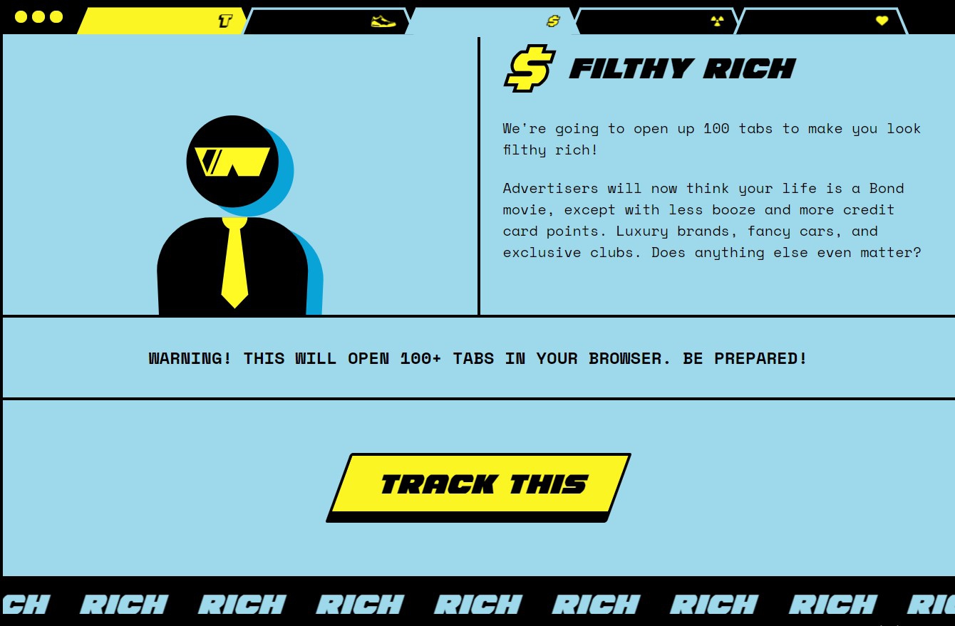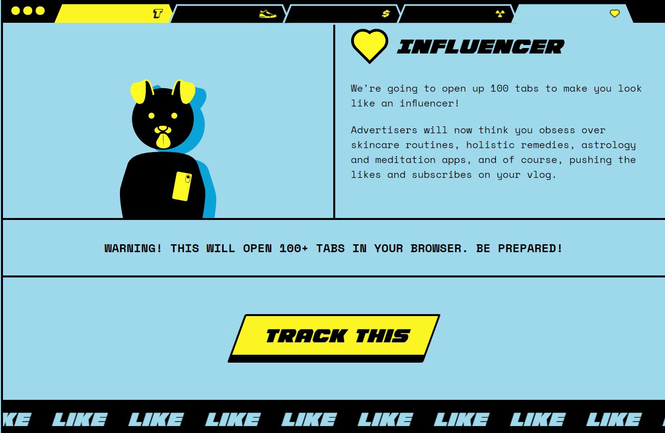 Track THIS позволяет полностью изменить контекстную рекламу и сбить с толку рекламодателей, которые собирают информацию о привычках пользователей без их согласия. Приложение открывает сразу сто вкладок, и эта информация позволяет полностью изменить контекстную рекламу на странице.