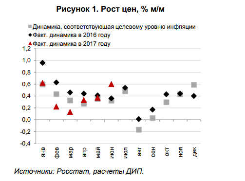 Возможное смещение сезонности в динамике плодоовощной продукции продолжит негативно отражаться на годовом уровне инфляции, как минимум, до сентября, удерживая ее выше 4% в годовом выражении.Эксперты отмечают, что после того как на прилавки начнут поступать сборы нового урожая, рост цен замедлится. Но если холода и дожди приведут к гибели культур, то негативное влияние этого фактора может сохраниться до весны 2018 года.