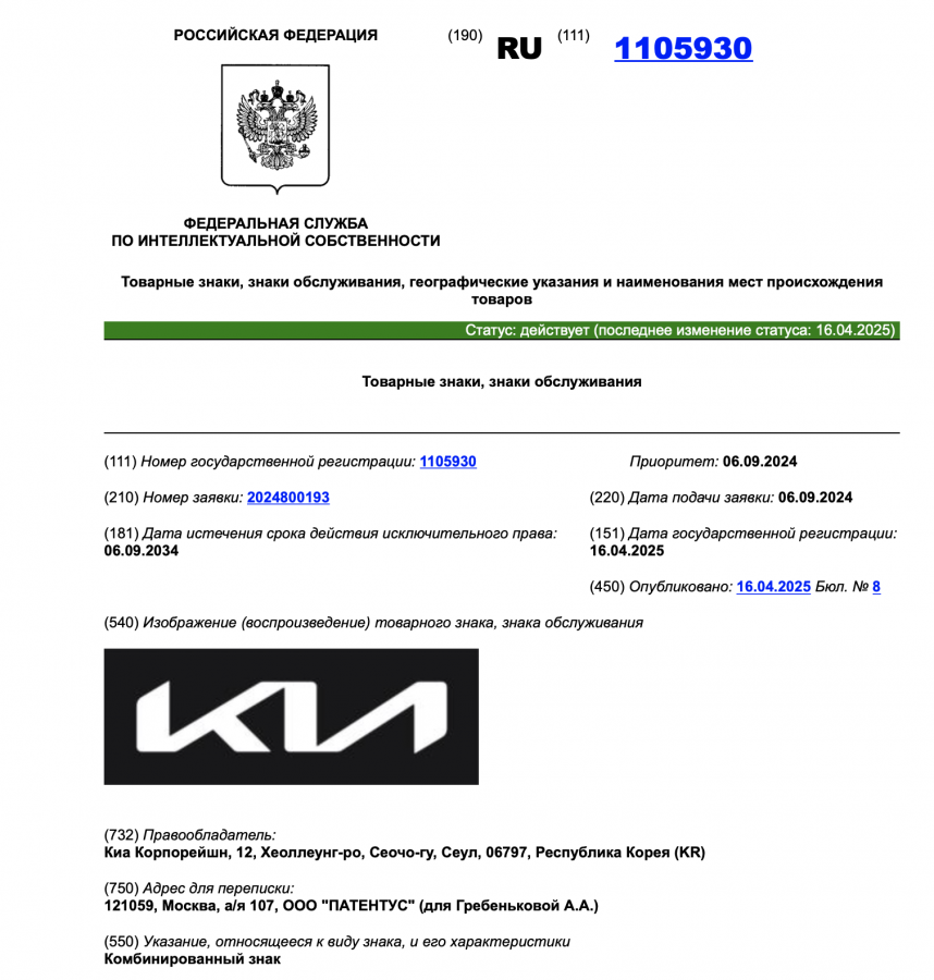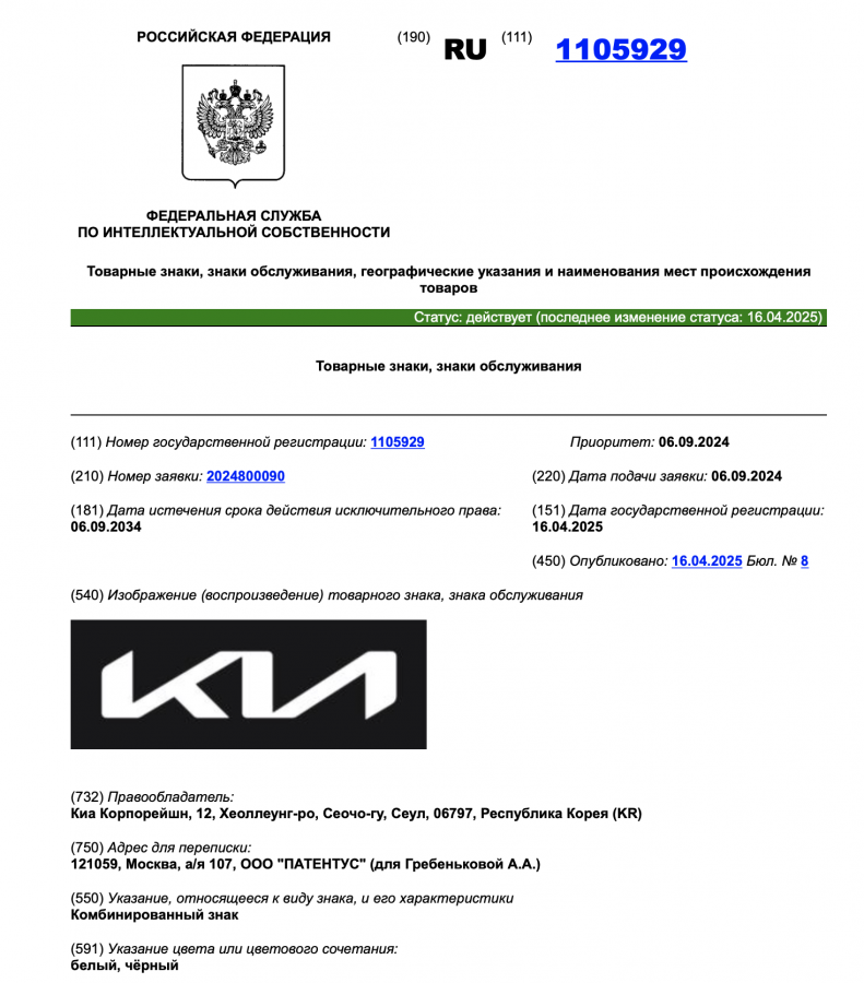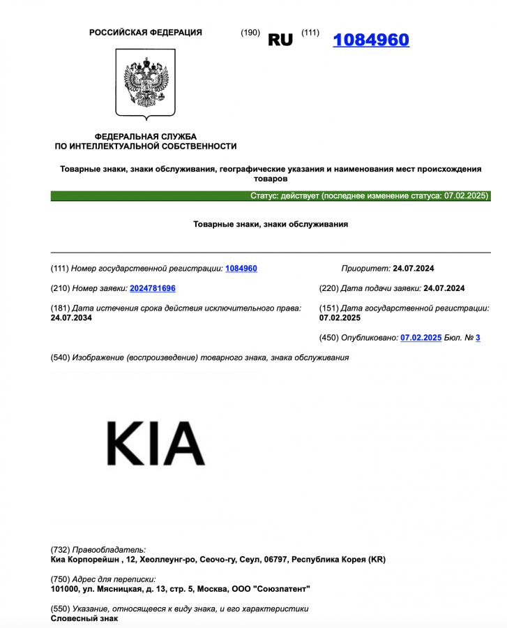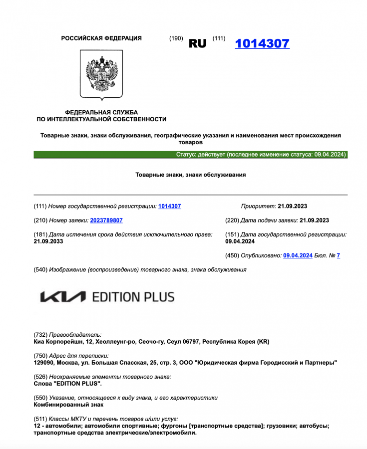 Согласно опубликованным документам, регистрация товарных знаков в РФ дает право Kia в том числе проектировать автомобильные заводы, предоставлять услуги по дизайну авто, а также заниматься производством и реализацией машин. Кроме того, разрешается торговля техническими маслами и смазочными материалами под брендом Kia.