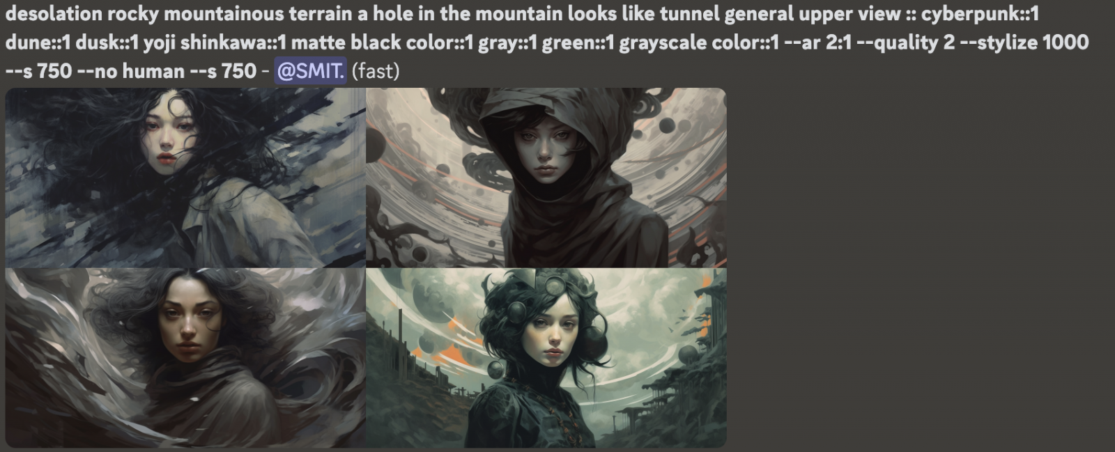 Не обошлось и без фейлов. Изначально мы пробовали создавать и локации, и персонажей в Midjourney. После того, как картинки героев были отрисованы, мы хотели приступить к генерации местностей, но столкнулись с проблемой: нейросеть обучилась на наших предыдущих запросах по персонажам и, когда мы начали задавать описание локации, в каждую картинку обязательно вставляла крупным планом рандомного человека (с сохранением стилистики запроса):