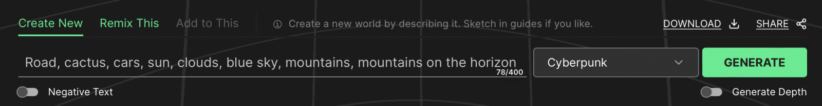 Функциональные возможности и интерфейс Skybox чем-то напоминает все стандартные нейросети: есть поле для ввода запроса, фильтры, панель инструментов для работы с изображением. Генерируя локации, мы выяснили, что запросы в этом ИИ все же отличаются от тех, к которым мы привыкли. Дело в том, что пользователю необходимо не описать то, что он хочет видеть, а просто перечислить желаемые элементы в виде некоего списка, и нейросеть поместит их на изображение: