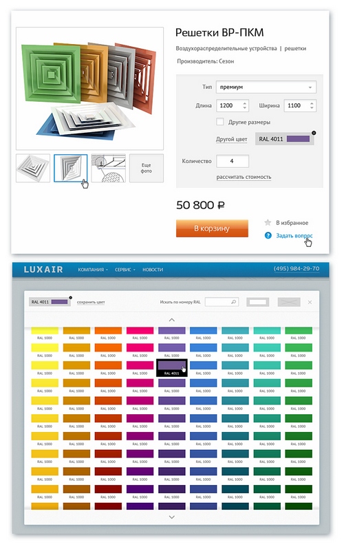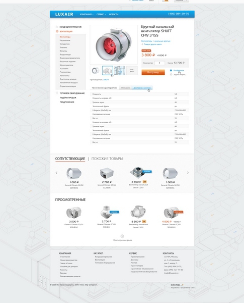 В каталоге продукции три основных раздела: вентиляция, кондиционирование и тепловое оборудование. Товары можно сортировать по цене и алфавиту, выбирать способ их отображения - краткими карточками или списком. В карточке товара содержится информация о цене товара и его основных характеристиках. Внизу отображаются просмотренные ранее товары.