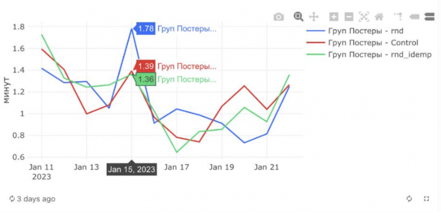 Результаты эксперимента многообещающие: показатель CTR, то есть доля кликнувших на новый постер от увидевших его, вырос. В группе, где ничего не менялось (отмечена на графике красной линией), конверсия ниже, чем в двух других группах с меняющимися постерами (синяя и зеленая линии).
