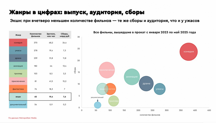 Однако количество релизов еще не равно коммерческому успеху: комедии лидируют по всем ключевым показателям (количество выпущенных фильмов в прокат, зрители, сборы), тогда как ужасы — хоть и выходят в 4 раза чаще, чем экшены — значительно уступают им по аудитории и сборам. Триллеры также демонстрируют слабые «бизнес-результаты», а самые стабильные отношения у зрителей к релизам, исходя из соотношения количества зрителей и количества вышедших картин — у приключений.