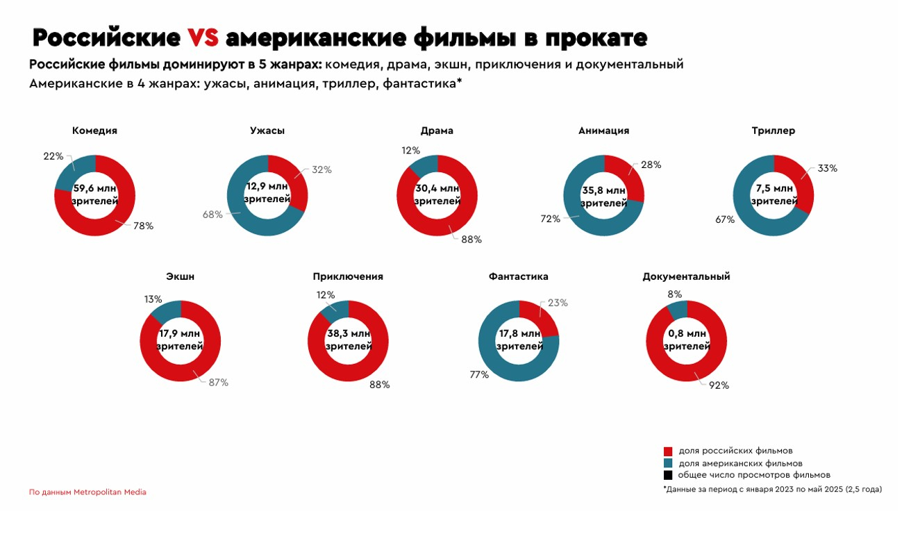 Анализ релизов за период 2023 — май 2025 показал, что 58% выпущенных картин приходятся на российские и американские проекты — они держат планку лидеров кинопроката. При этом каждая страна имеет свои сильные жанровые позиции: российские фильмы доминируют в жанрах комедии, драмы, экшна, приключений и документального кино, а американские в жанрах ужасов, анимации, триллера и фантастики.