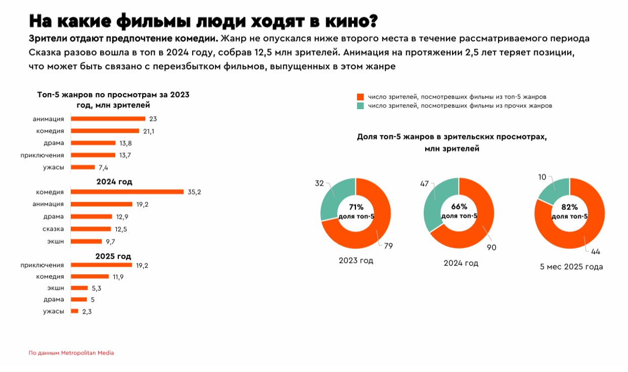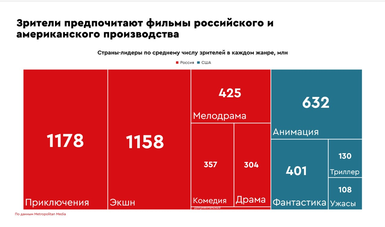 Комедии и приключения. Комедии показывают стабильный отклик аудитории и лучшую конверсию маркетингового интереса в посещения; приключения — эффективны по соотношению «зрители/кол-во релизов». Эти жанры — «низкорисковые» точки роста при правильной упаковке и промо.
