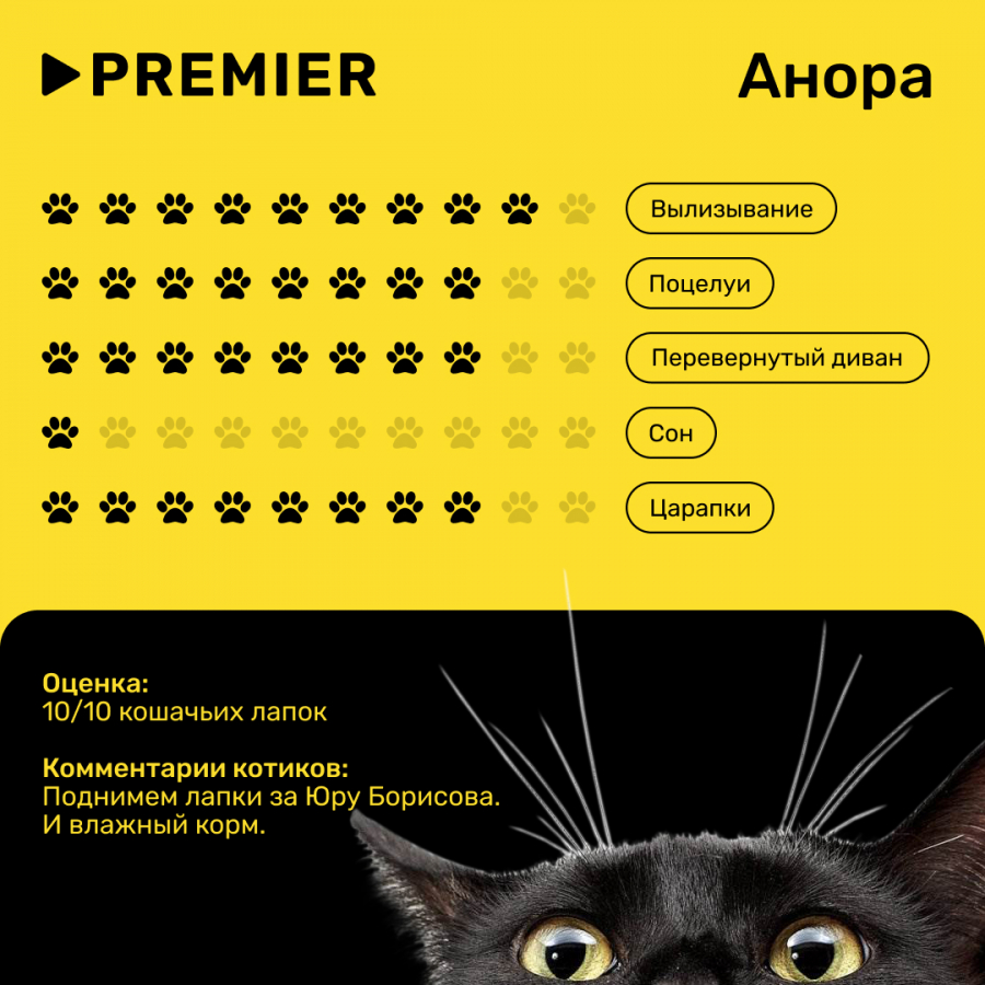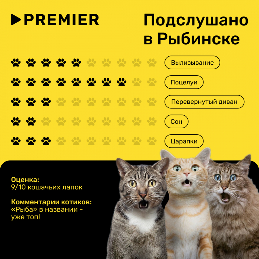 Во время просмотра фильма «Анора» максимальное количество раз зафиксировано желание поймать лапой Юру Борисова. А название сериала «Подслушано в Рыбинске» вызвало у котов непрерывное мурчание.