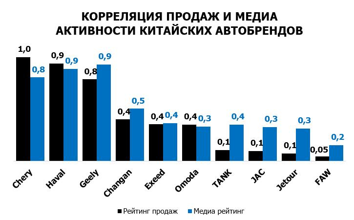 Непрерывное присутствие в СМИ и соцсетях прямо связано с количеством машин, которые китайские бренды ежегодно продают в РФ. Это особенно заметно в отношении тройки лидеров (Chery, Haval и Geely) и брендов, занявших средние позиции (Changan, Exeed, Omoda). В третьем кластере, замыкающем рейтинг, наблюдается обратная ситуация. Но в этом случае невысокие продажи коррелируют со слабой медиаактивностью.