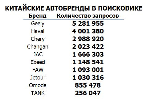 Первую строчку по количеству поисковых запросов в «Яндексе» занял Geely, от которого существенно отстаёт Haval. На третьем месте Chery.