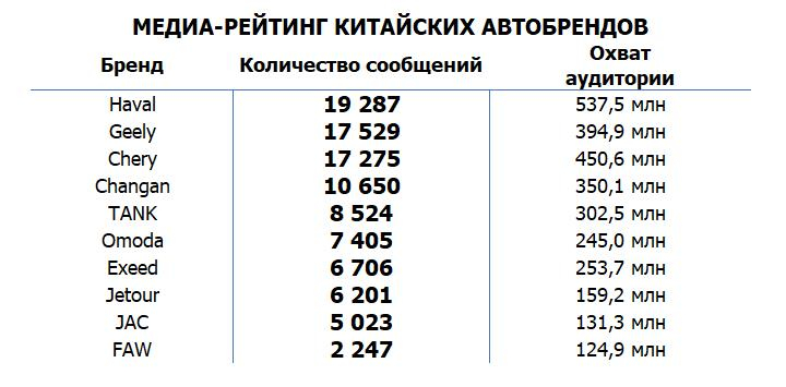 Отечественные СМИ проявляют высокий интерес к китайским автомобильным брендам. В особенности к Haval, Geely и Chery. За полгода о каждой из этих марок было опубликовано 17−19 тыс. материалов. При этом у Geely охват аудитории был ниже, чем у менее часто упоминаемой Chery. Это говорит о том, что некоторые бренды в своих информационных кампаниях ориентируются на качественные издания с высоким охватом, а не гонятся за большим количеством публикаций.