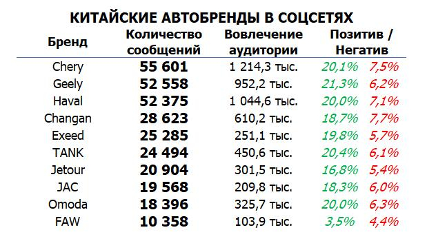 В тройку лидеров по публикациям в соцсетях вошли Chery, Geely и Haval. У них огромное преимущество перед другими брендами по количеству сообщений. Они также обгоняют конкурентов по вовлечению аудитории: сообщения с их упоминанием чаще лайкали, комментировали и репостили.