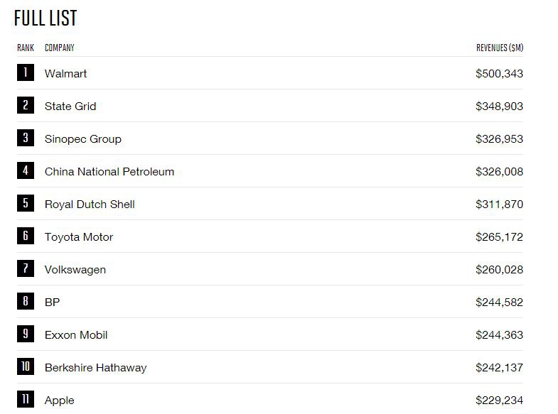 По оценке Fortune, в 2017 году совокупный доход участников рейтинга составил 30 трлн долларов, а их выручка практически достигла 1,9 трлн долларов (+23%). Лидером является Walmart с оборотом 500,3 млрд долларов. В первую сотню попали 22 компании с материкового Китая, среди них только одна одновременно технологическая и без госучастия — Huawei, она находится на 72-м месте.