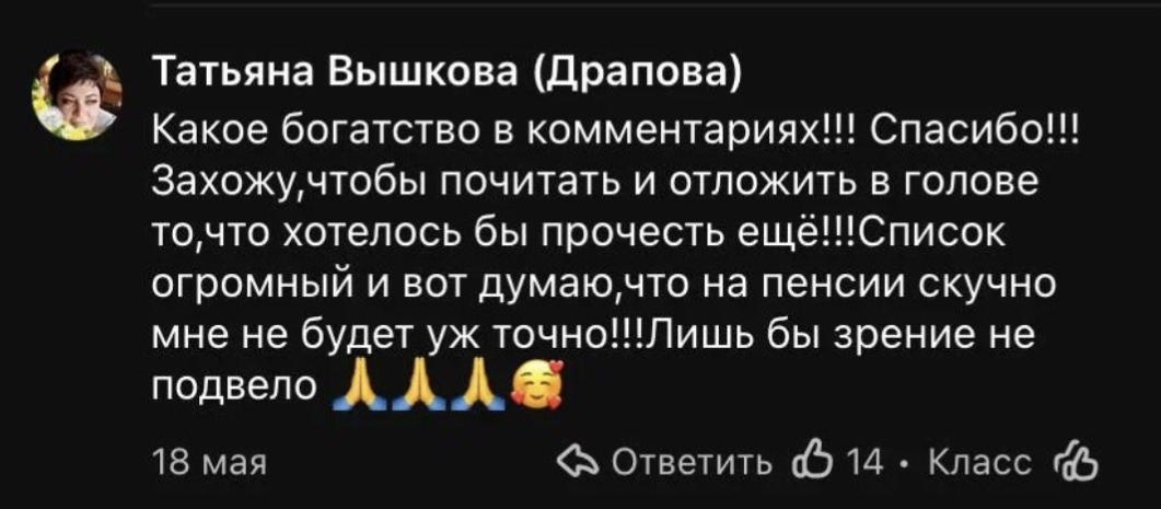 - участники оставили под конкурсным постом более 10 тыс. содержательных комментариев, среди которых были не только персональные подборки книг, но и рецензии, мнения и вопросы авторам «конкурирующих» книжных топов; фактически во время конкурса в группе сформировалось активное внутреннее комьюнити с общими интересами и уважительным отношением друг к другу;