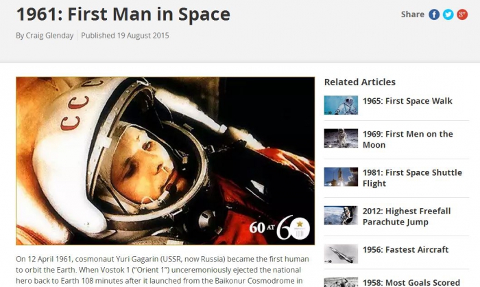 За 60 лет компания Guinness и редакторы книги зафиксировали множество достижений. Проект стал настоящим зеркалом истории: в 1961 году он чествует первого человека в космосе, за год до этого отмечает погружение на дно Марианской впадины, в 1965-м празднует первый выход в открытый космос. Юрий Гагарин, Марлон Брандо, Стиви Уандер, Пеле, первый банкомат, первый мобильный звонок — все это запечатлено на страницах Книги.