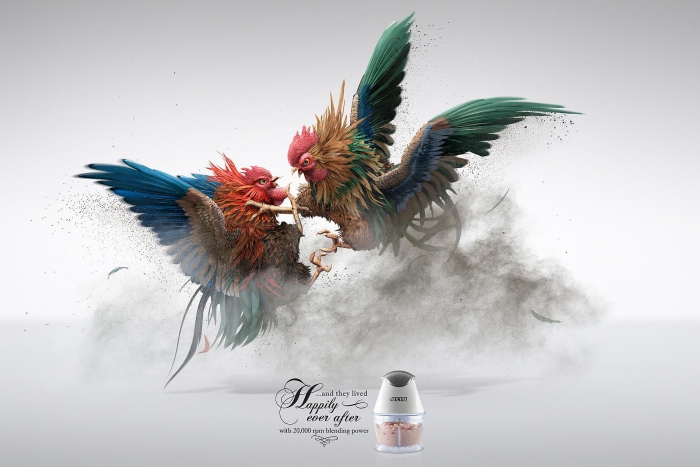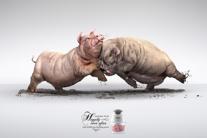 Otto прорекламировал блендер для мяса с помощью серии кровожадных принтов. Плакаты изображают дерущихся животных – быков, свиней и петухов. Под животными нарисован блендер с мясом разного цвета – белого под птицами и красного под быками. Слоган поясняет, что они жили долго и счастливо, ведь их смешали на скорости 20000 оборотов.