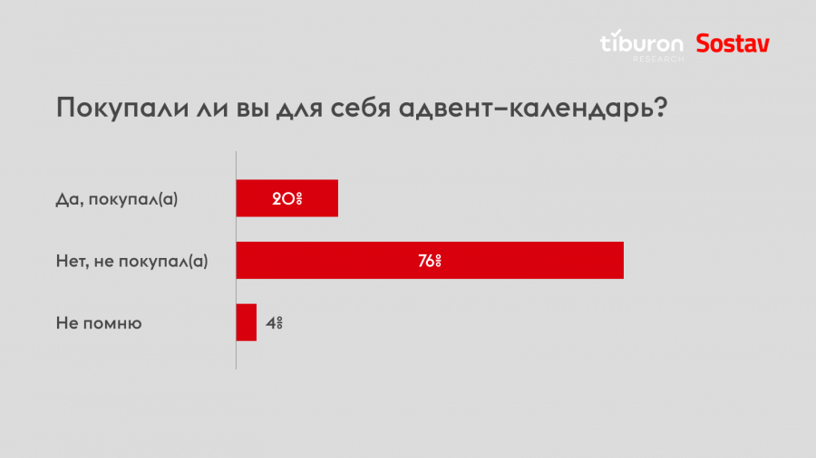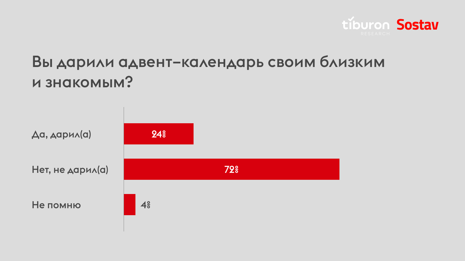 Чуть меньше трети дарили адвенты близким, знакомым или покупали для себя. Если дарили или покупали, то почти треть из них были со сладостями, шоколадом (29%), на втором месте по популярности идут календари с косметикой (20%). За ними идут адвенты с игрушками (6%).