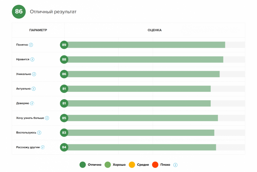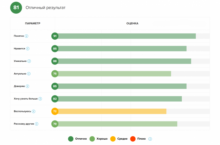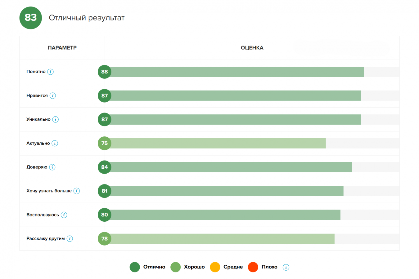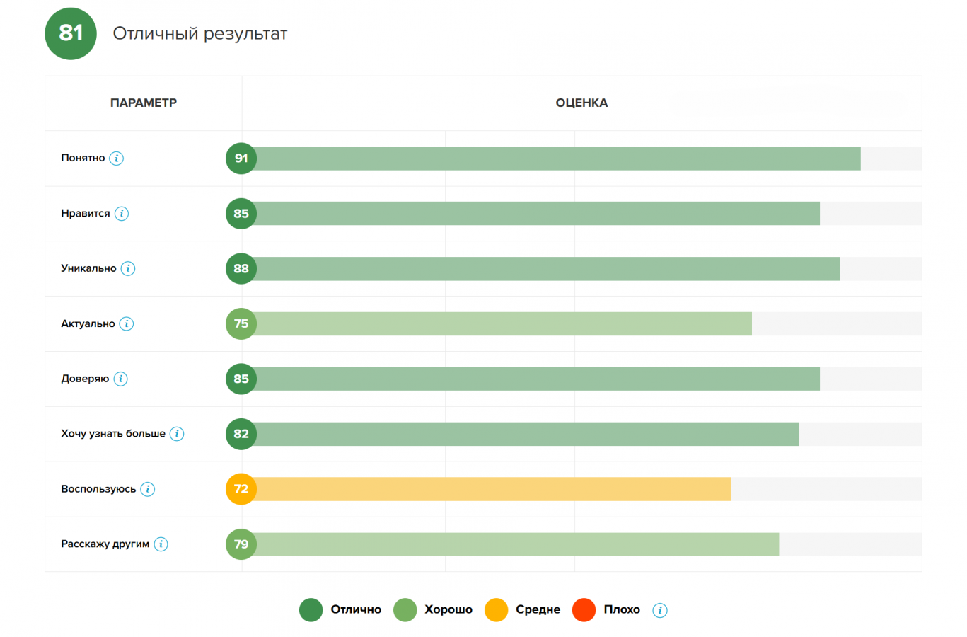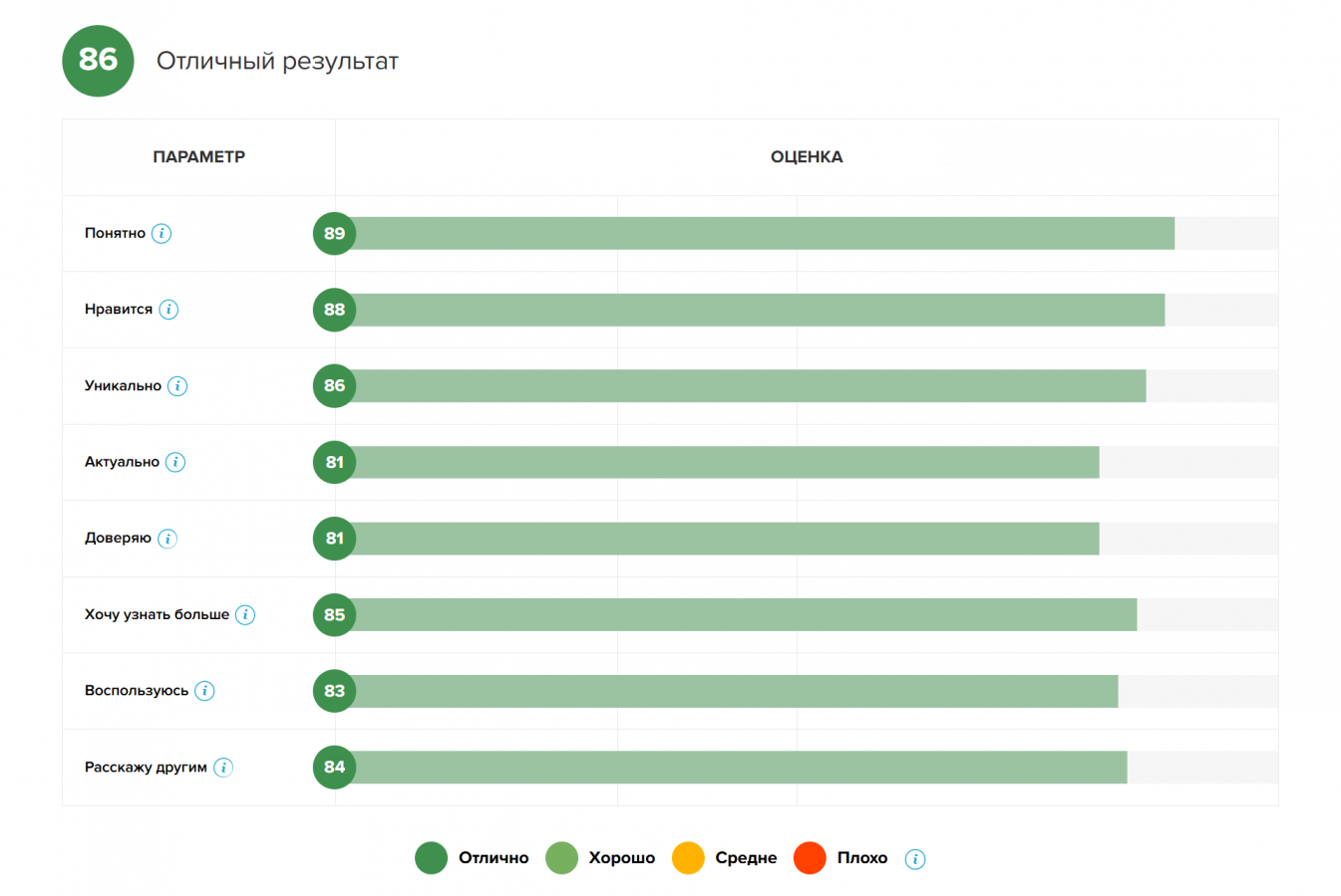 Оценки идеи адвента с наполнителями для каши на завтрак тоже почти все в «зеленой» зоне. Только параметры «Актуально» и «Расскажу другим» получили оценку «Хорошо». Респондентам нравится возможность разнообразить свой завтрак и добавить новогодней атмосферы таким необычным способом.