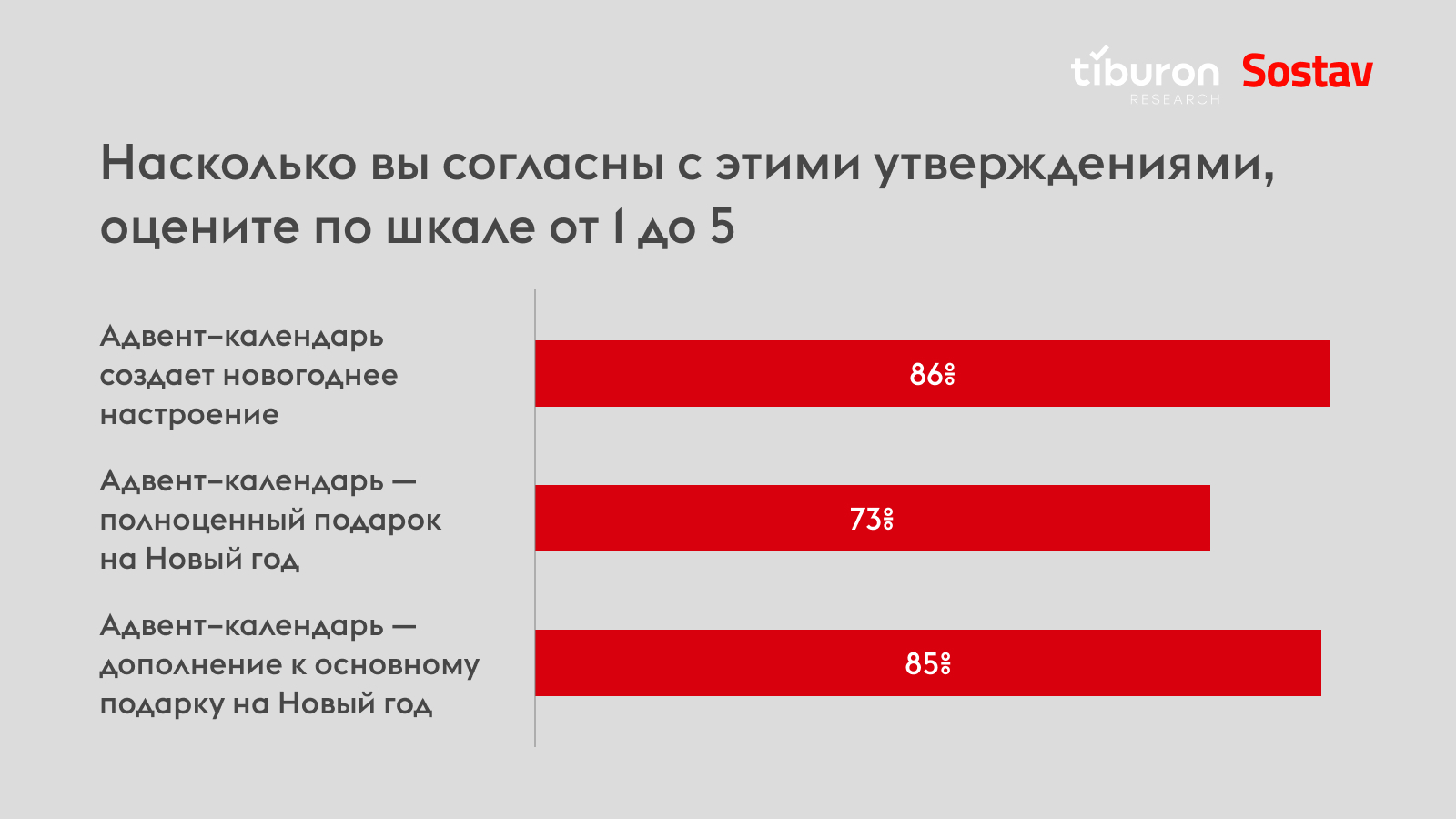 Если говорить в целом про формат адвент-календаря, то 86% людей считают, что он создает новогоднее настроение. В качестве полноценного подарка его оценивают 73% людей. А в качестве дополнения к основному подарку — 85%. Тут можно смело говорить, что адвент-календарь — отличный новогодний подарок как в качестве основного, так и в качестве дополнительного, и брендам нужно смотреть в эту сторону.
