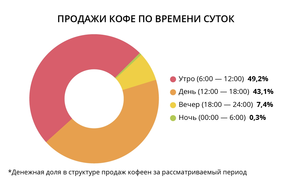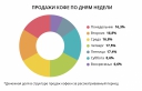Типичный посетитель кофейни забегает за любимым напитком с 6 до 12 утра: на это время приходится половина продаж кофе. Еще 40% — на дневное время, вечером продаётся лишь 7% кофе, что может быть связано с закрытием большинства кофеен в ночное время.