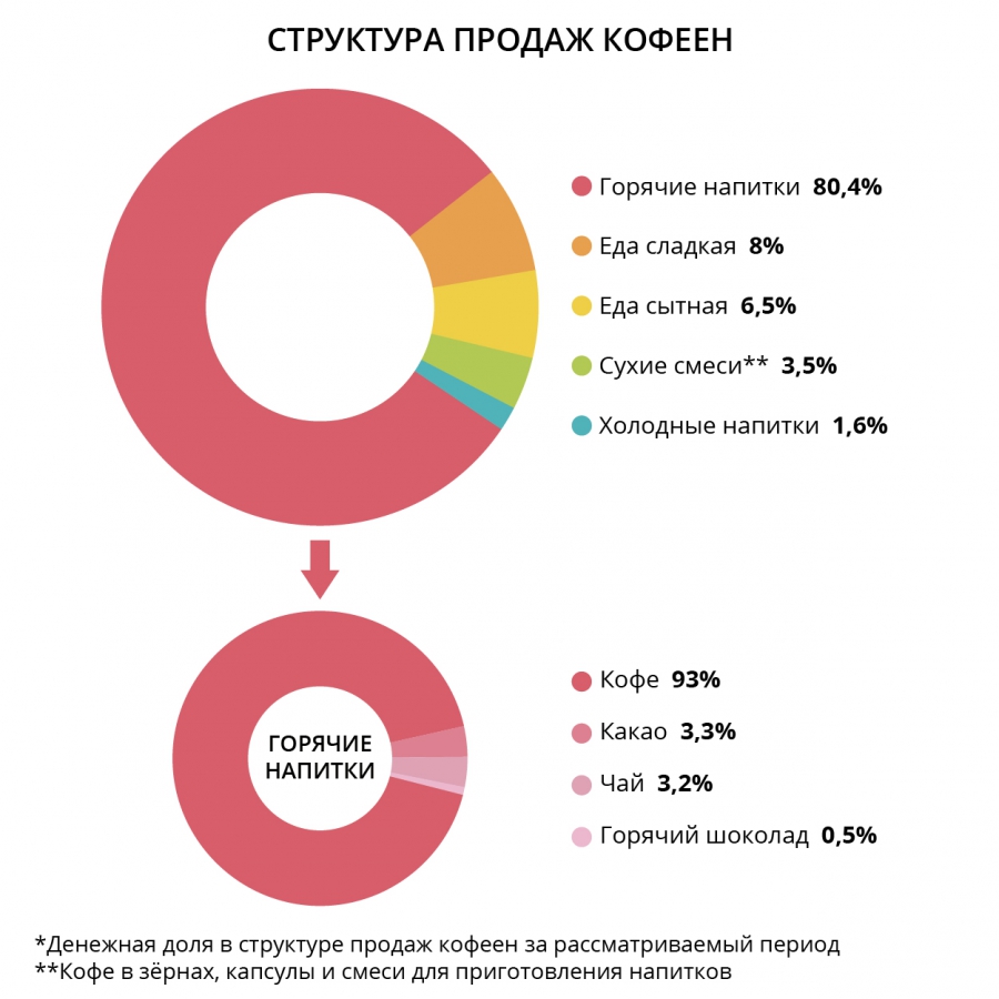Выяснилось следующее. Ядро аудитории кофеен в столице — молодые люди в возрасте 18−35 лет, которые предпочитают покупать капучино по утрам в рабочие дни и тратят в кофейне около 200 рублей. 80% продаж кофеен приходится на горячие напитки, причем 9 из 10 горячих напитков — это кофе. На еду приходится лишь около 15% продаж, холодные напитки составляют менее 5% продаж. Самый популярный напиток в кофейнях — капучино. На него приходится более 45% всех продаж кофе. Доля продаж кофе с молоком составляет около 75%, в то время как доля черного кофе — лишь 15%.