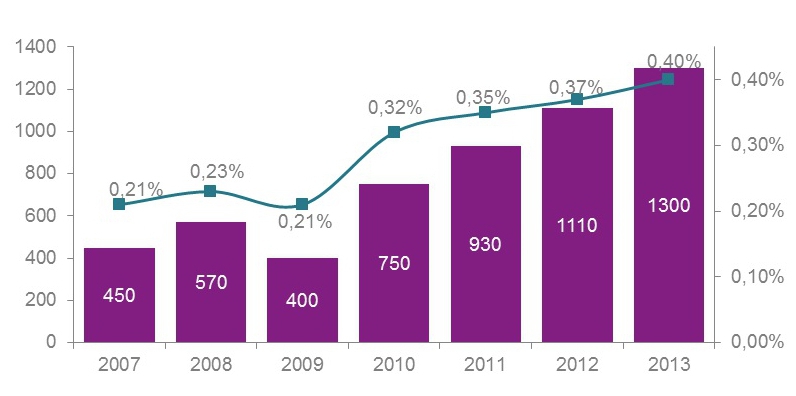 Объемы и динамика доли сегмента рекламы в кинотеатрах в России в 2007-2013 гг., млн. руб. без НДС