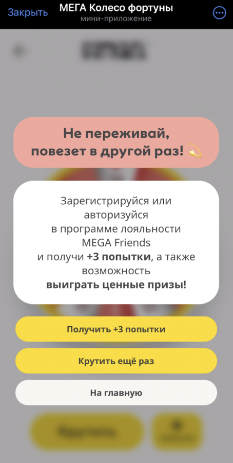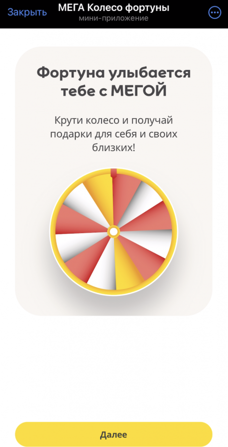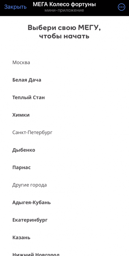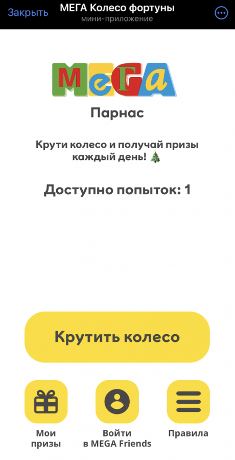 Пользователи, которые решили испытать удачу и получить призы, должны были авторизоваться в боте, выбрать ближайшую МЕГУ и вращать колесо.