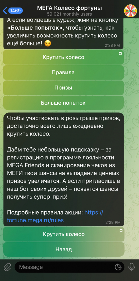 Развитие нашего чат-бота и проведение на его базе масштабного розыгрыша «Колесо фортуны» также показало качественные результаты, что еще раз подчеркнуло актуальность Telegram для эффективного взаимодействия с гостями МЕГИ.