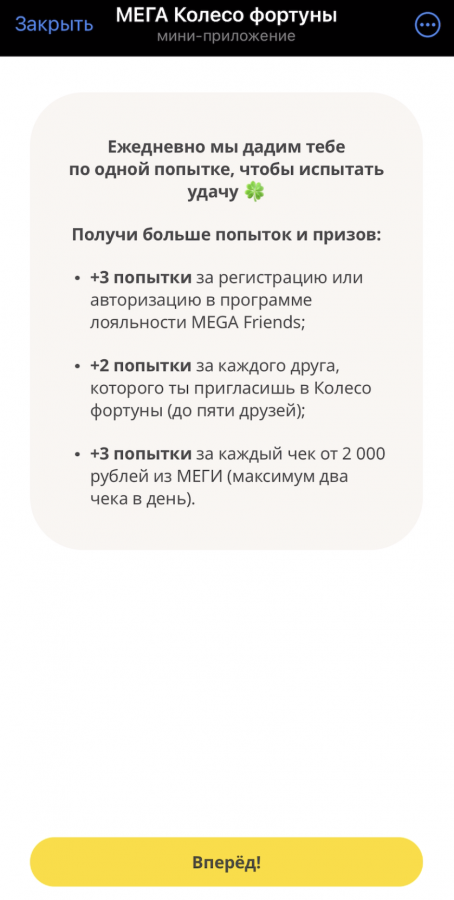 Ежедневно каждый участник получал 1 попытку. Вращая колесо, случайным образом можно было выиграть призы от партнеров в виде купонов на подарки и скидки. Далее использовать их в торговом центре, интернет-магазинах арендаторов или на стойке информации в МЕГЕ.