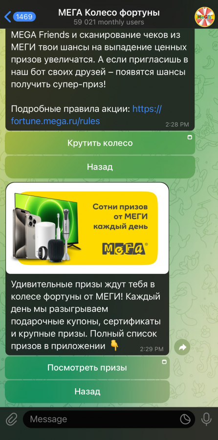 креативной студией SMIT. продолжают развивать чат-бота на базе Telegram. Бренд регулярно проводит розыгрыши для поддержания диалога с клиентами. Ранее цифровой инструмент собирал целевую аудиторию для рассылок и прямой коммуникации, а также использовался в маркетинговых активностях, включая чековые механики. Летом на базе бота прошла акция «Миллион с МЕГОЙ». Она помогла достичь 1-го млн участников в программе лояльности MEGA Friends. Теперь чат-бот с 31 тыс. уникальных пользователей стал ключевым инструментом масштабного розыгрыша МЕГИ под названием «Колесо фортуны». Подробностями с Sostav поделилась команда проекта.