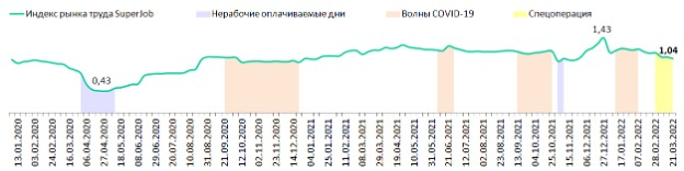 За неделю HR-активность работодателей на рынке труда незначительно скорректировалась (минус три процентных пункта): индекс рынка труда SuperJob находится на отметке в 1,04 пункта, что на 4% превышает средние показатели аналогичных периодов 2017—2019 годов. В среднем число вакансий с начала проведения спецоперации снизилось на 11 процентных пунктов.