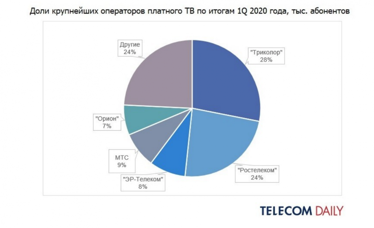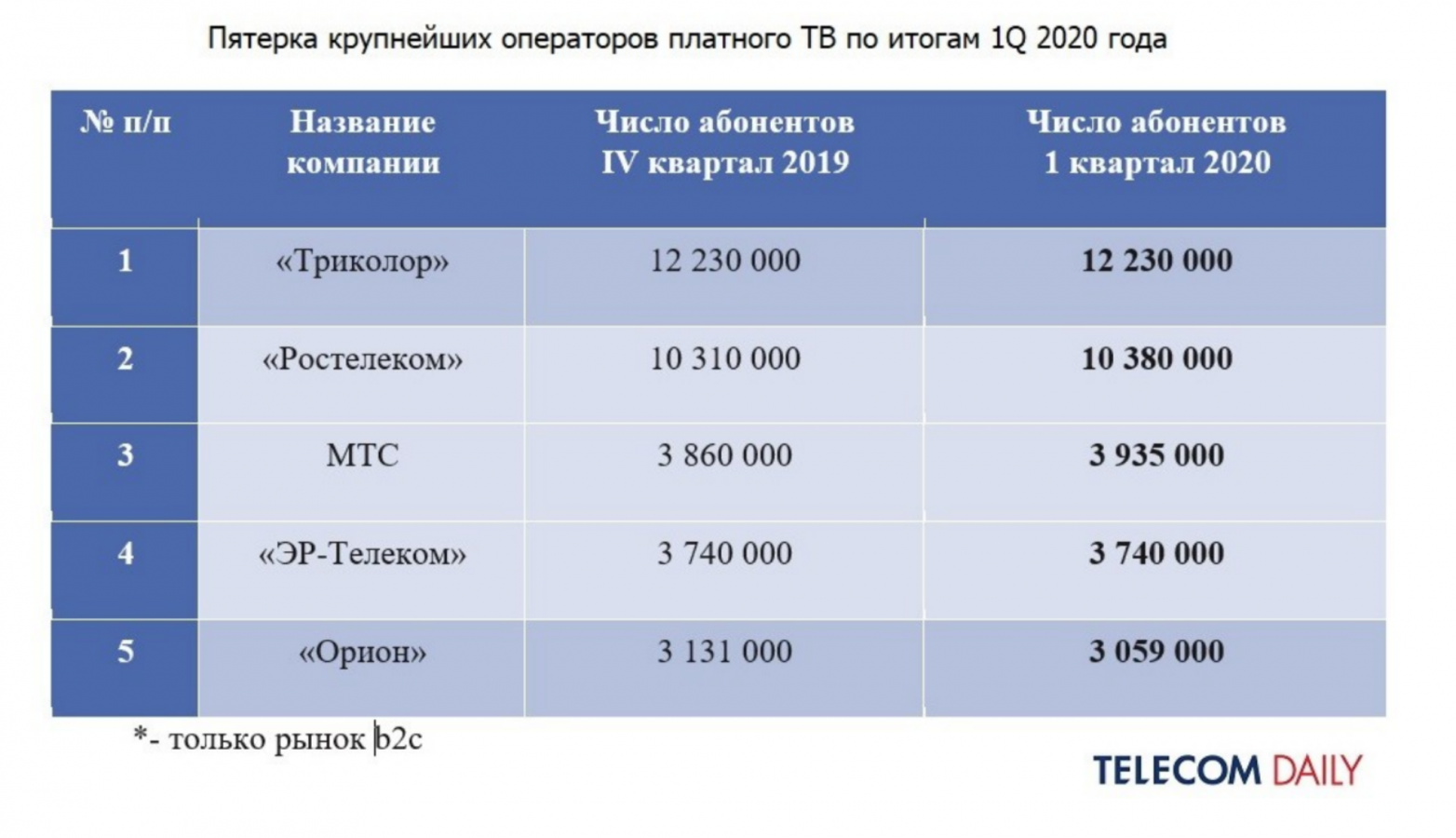 В пятерке крупнейших операторов платного ТВ по-прежнему лидирует «Триколор». Абонентская база оператора осталась на прежнем уровне. При этом «Ростелеком» и МТС смогли увеличить число абонентов на 70 и 75 тыс. соответственно.