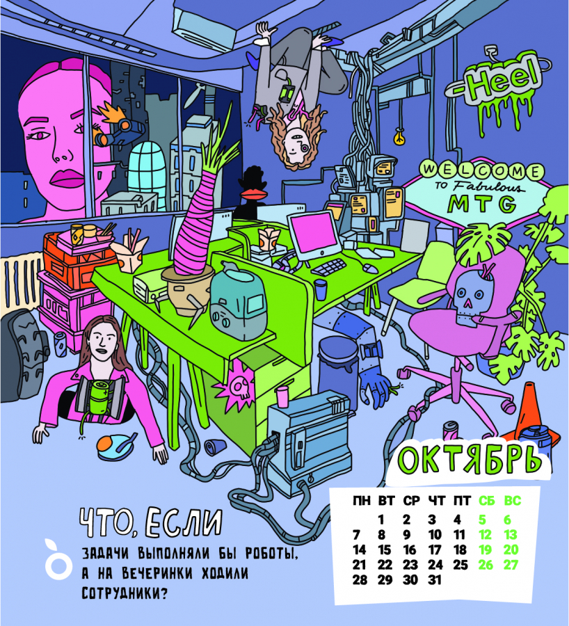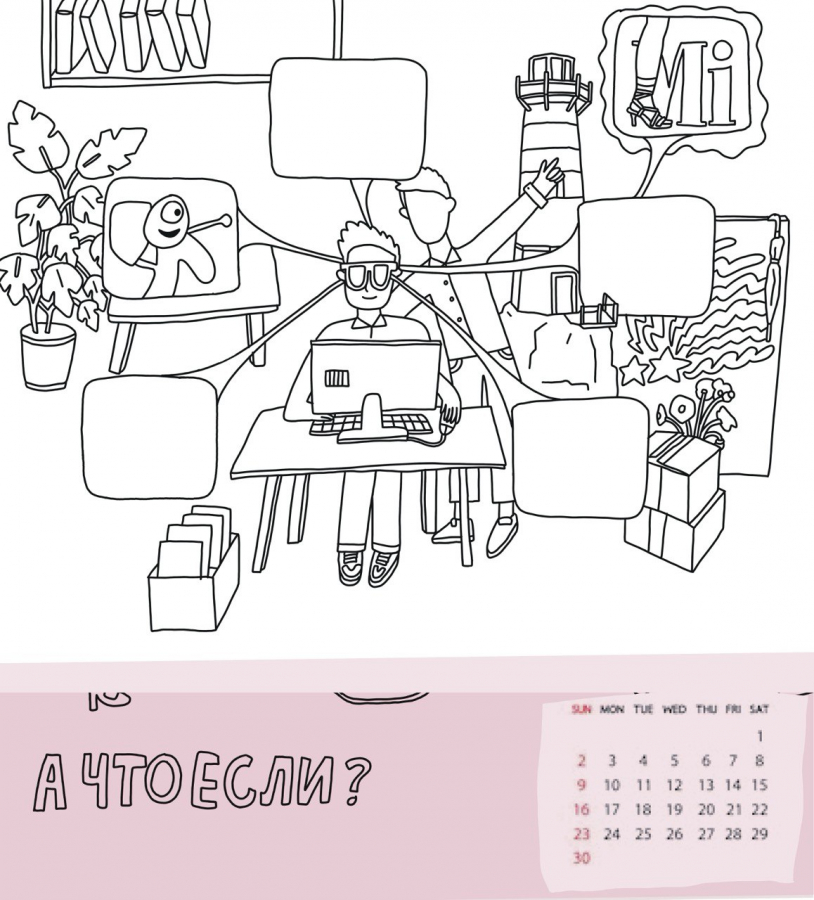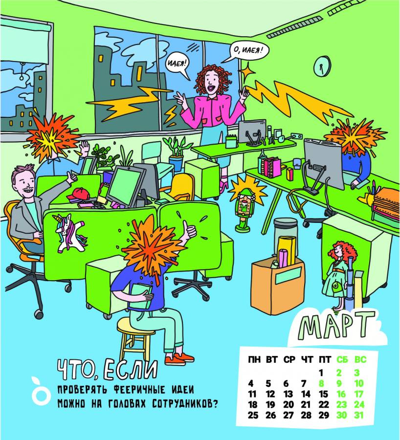 В основу концепта легла серия комиксов Marvel «What If?» В ней известные сюжеты разворачивались непривычным, парадоксальным путём. Это отличная креативная рамка, которая позволила нам обыграть повседневные ситуации из жизни рекламщиков. Каждая страница месяца отражает свою фантастическую сценку и сопровождается надписью с началом «Что, если???».
