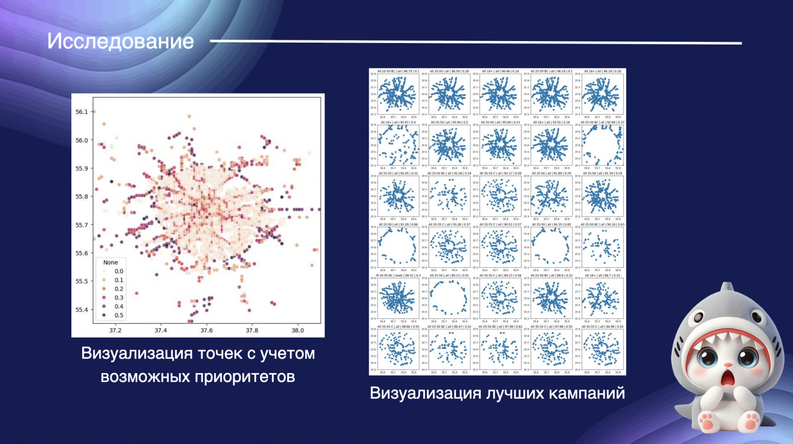 1. На кейсе по автоматизации сбора адресных программ в ООН команды не только добавляли дополнительные факторы оценки эффективности (например, расстояние до светофоров или ТЦ), но и доработали функционал тепловых карт. О них ничего не было сказано в поставленной задаче, но это позволило сразу повысить качество визуализации результатов и помочь в обосновании подбора адресной программы.