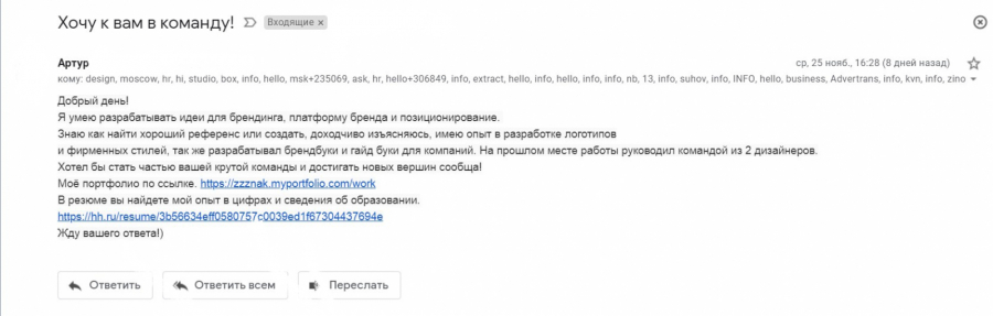 Опыт в разработке логотипов, руководство командой из двух дизайнеров — казалось бы, здесь представляется молодой, но подающий надежды креатор. Но… Во-первых, в обращении нет ни одного упоминания конкретного агентства. Во-вторых, в получателях того самого письма было еще 169 адреса.