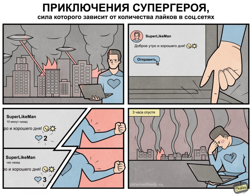 Сила Суперлайкмена зависит от количества лайков, которые ему ставят в социальных сетях.