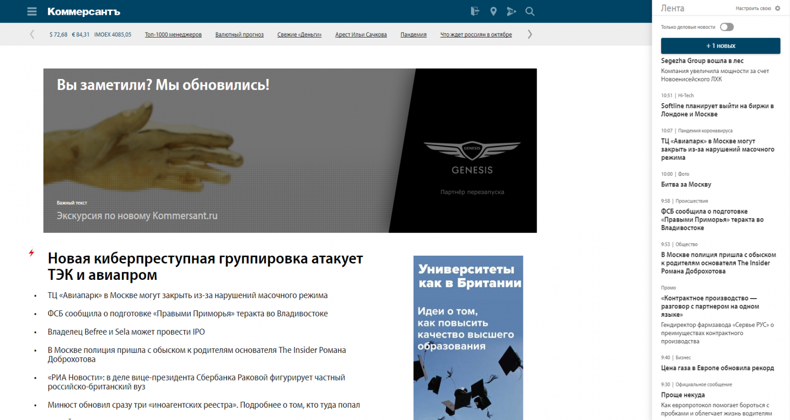 Издательский дом «Коммерсантъ» представил обновленный сайт. Изменения касаются оформления и функционала ресурса — на портале больше нет газетного представления контента, навигацию упростили, а интервью с первыми лицами бизнеса и власти дизайнеры разместили в блоке «Главное». Также в тематической рубрикации больше места отдано деловому блоку, сообщили Sostav в издании.