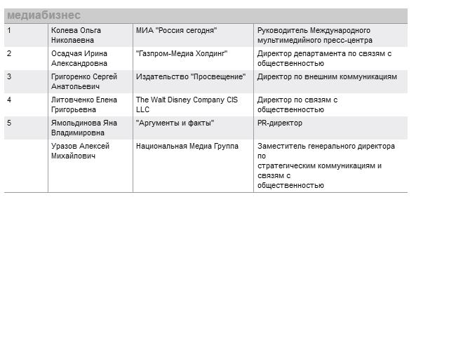 В рейтинге отдельной строкой были выбраны лучшие директора по общественным и корпоративным связям. Манджиков Очир Алексеевич, директор по связям с общественностью «Яндекс», по-прежнему возглавляет этот рейтинг, Зверева Татьяна Валерьевна, директор по связям с общественностью САП СНГ в России и СНГ, по сравнению с прошлым годом поднялась, на одну позицию и стала второй. Турцева Екатерина Николаевна, вице-президент по глобальным коммуникациям Acronis вошла в тройку лучших.