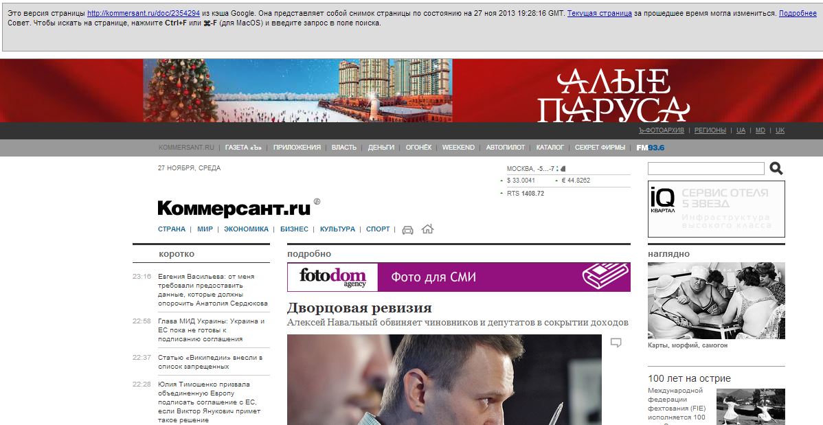 «Коммерсантъ» удалил со своего сайта материал «Дворцовая ревизия», информационным поводом для которого стало расследование Алексея Навального. Оппозиционер обвинил ряд высокопоставленных чиновников в том, что они задекларировали не всю собственность. Документы были опубликованы в его блоге.