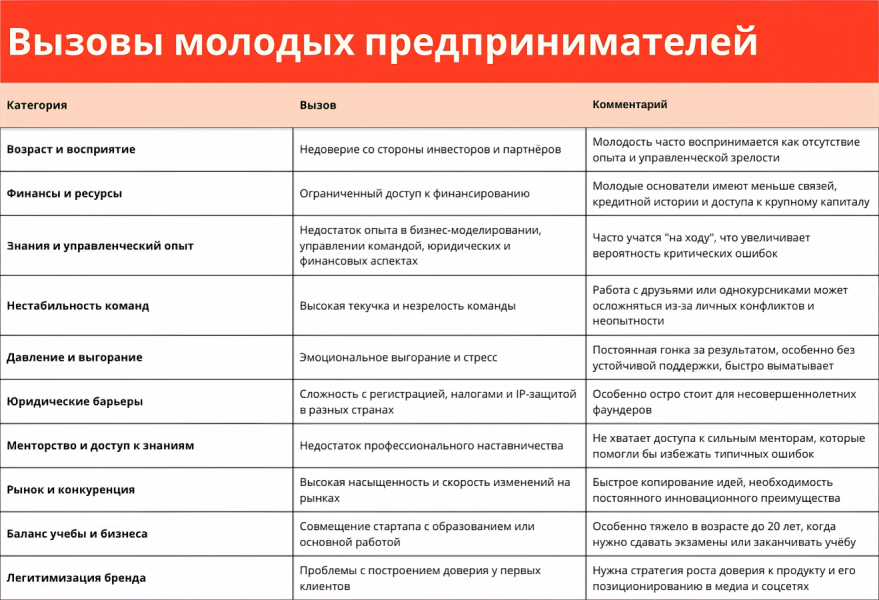 - Недостаток опыта и знаний. Несмотря на высокий уровень цифровой грамотности, многие молодые предприниматели сталкиваются с дефицитом опыта в управлении бизнесом, стратегии развития и ведении финансов. Это может быть вызовом, особенно для тех, кто начинает свою карьеру в возрасте от 18 до 20 лет. Тем не менее, многие из них преодолевают эти проблемы, привлекая наставников, консультантов или обучаясь на ошибках.