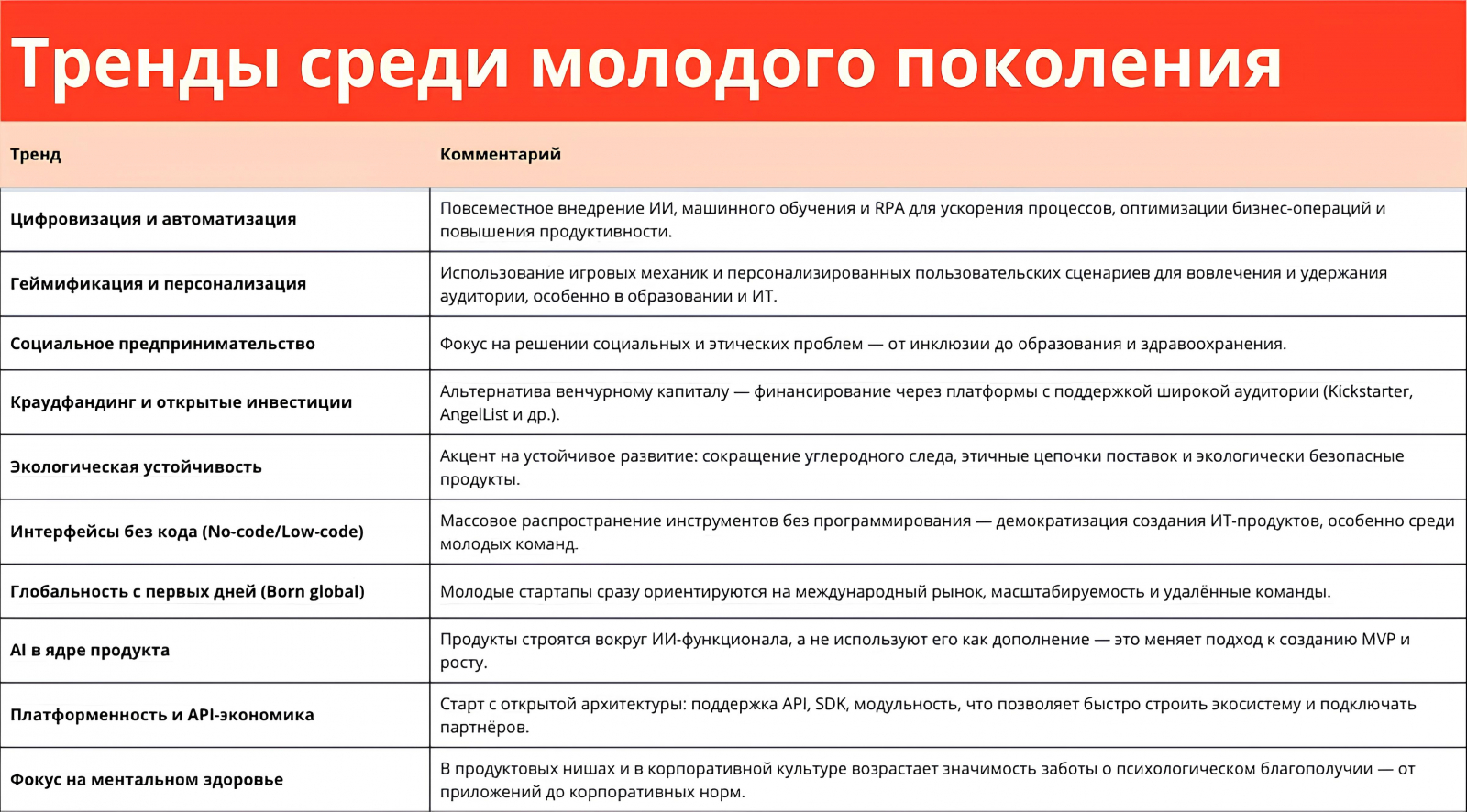 Стартапы, основанные молодыми людьми, развиваются на фоне значительных изменений в мировом бизнес-ландшафте, которые связаны с технологическими достижениями и изменением потребностей пользователей. Важно отметить, что предприниматели, относящиеся к поколениям миллениалов и поколения Z, имеют разные подходы к бизнесу, что обуславливает их уникальные методы решения проблем и формирования новых продуктов.